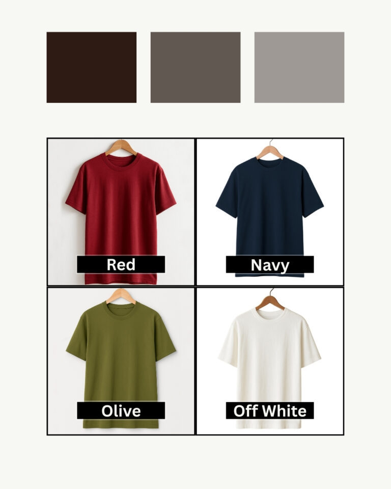 Choosing the perfect drop shoulder T-shirt color becomes easier when you understand how each shade complements Bangladeshi skin tones. Light wheatish skin tones look best in jet black, navy blue, olive green, and medium brown, as these colors create a bold yet natural contrast. Wheatish or medium tan tones match beautifully with black, off-white, navy, and olive, offering a balanced and refined look. For medium brown skin, vibrant and contrasting shades like off-white, red, navy blue, and black create the strongest visual impact. Deep brown and dark brown skin tones stand out most in high-contrast colors such as off-white, red, olive green, and navy blue, which enhance richness and clarity. By pairing the right T-shirt colors with each skin tone, anyone can achieve a more confident, stylish, and visually appealing streetwear look.